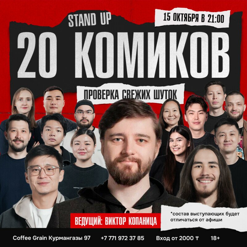 На одной сцене за вечер выступят 20 комиков и каждый принесет вам свой взгляд, стиль и свежие шутки.