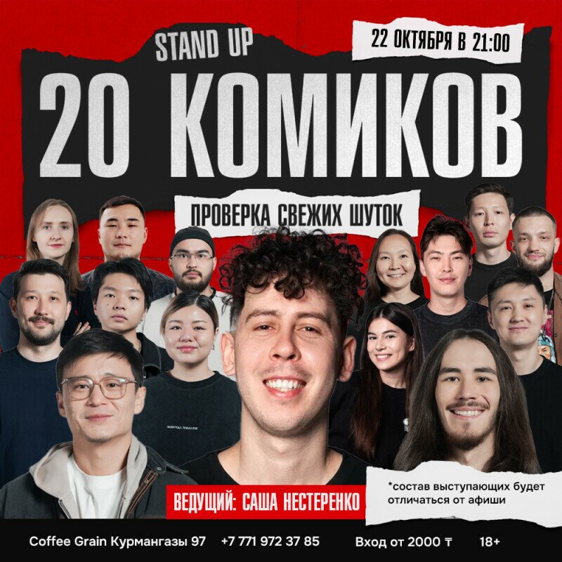 На одной сцене за вечер выступят 20 комиков и каждый принесет вам свой взгляд, стиль и свежие шутки. Перед вами выступят опытные стендап-комики и новички, которые только начинают путь в стендапе.