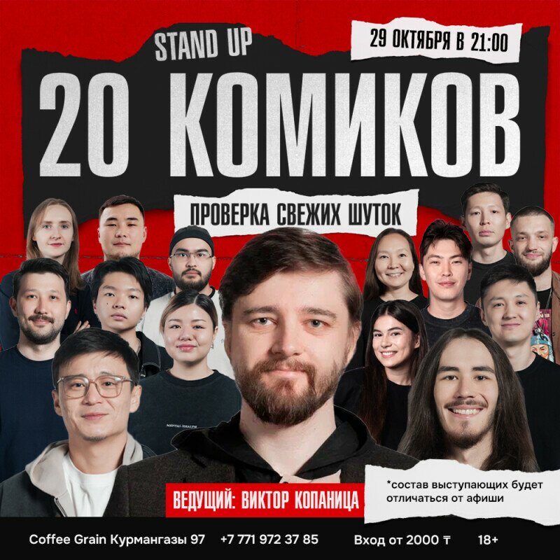 На одной сцене за вечер выступят 20 комиков и каждый принесет вам свой взгляд, стиль и свежие шутки.