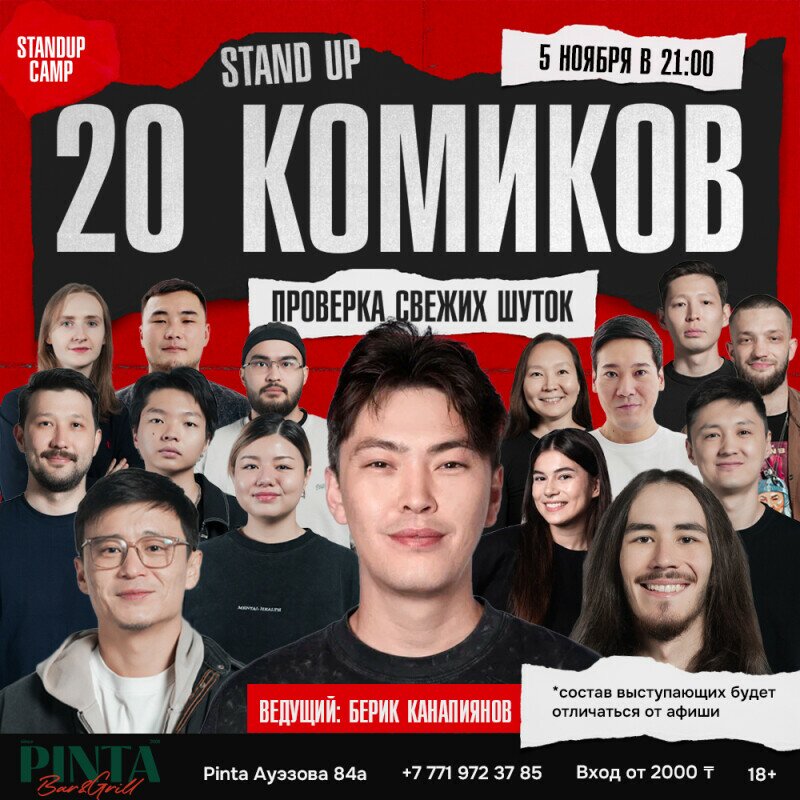 На одной сцене за вечер выступят 20 комиков и каждый принесет вам свой взгляд, стиль и свежие шутки.