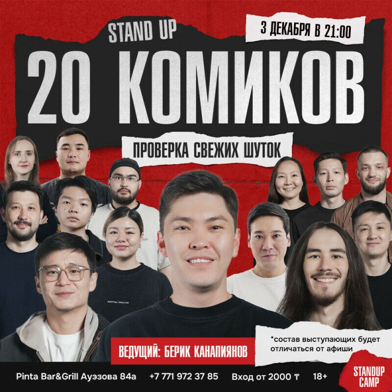 Ведущий: Берик Канапиянов — комик, который совмещает в выступлениях опыт в стендап-комедии и талант импровизации. Выступает на русском и казахском языках. Вы не раз видели его в своих рилсах. А также могли видеть на Youtube. в проектах "Битва комиков", "Тюркский разговорник" и "Setap tar"