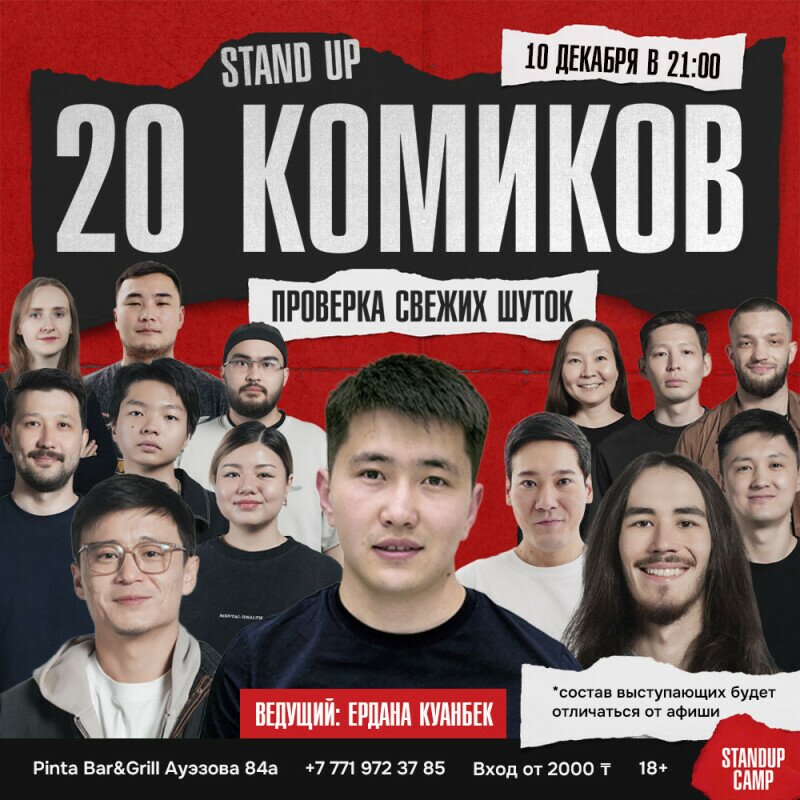 На одной сцене за вечер выступят 20 комиков и каждый принесет вам свой взгляд, стиль и свежие шутки.