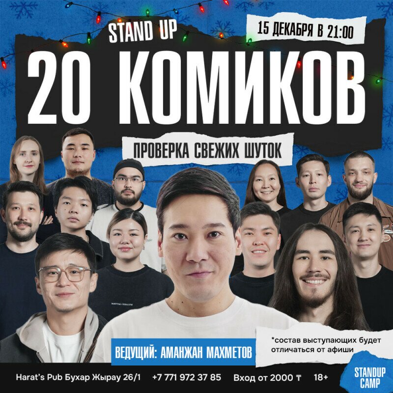 На одной сцене за вечер выступят 20 комиков и каждый принесет вам свой взгляд, стиль и свежие шутки.