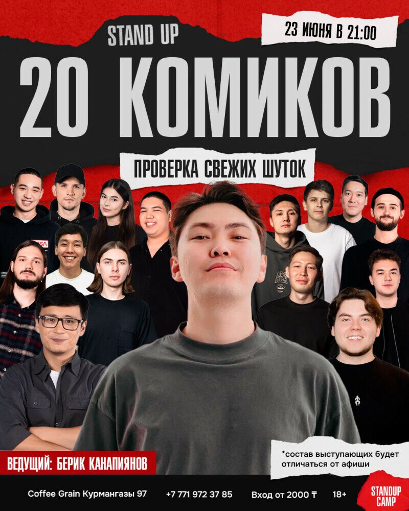 Ведущий: Берик Канапиянов — комик, который совмещает в выступлениях опыт в стендап-комедии и талант импровизации. Выступает на русском и казахском языках. Вы не раз видели его в своих рилсах. А также могли видеть на Youtube. в проектах «Битва комиков», «Тюркский разговорник» и «Setap tar»