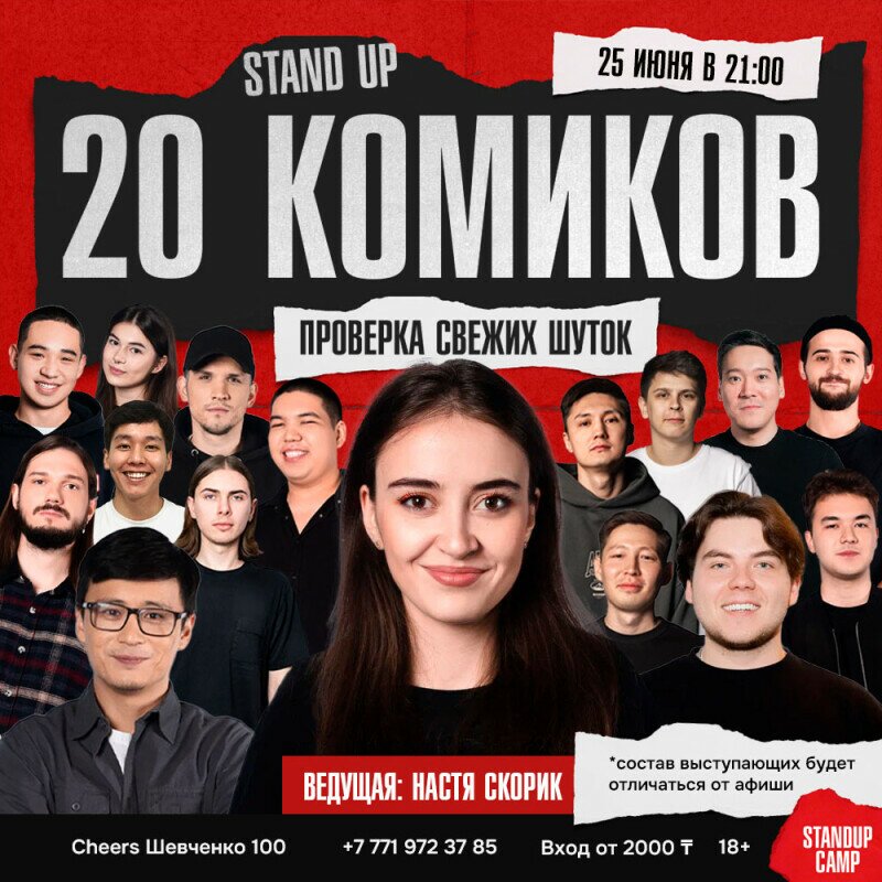 На одной сцене за вечер выступят 20 комиков и каждый принесет вам свой взгляд, стиль и свежие шутки. Перед вами выступят опытные стендап-комики и новички, которые только начинают путь в стендапе.