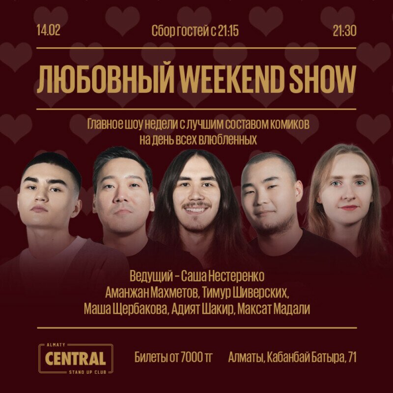 Самое романтичное событие года приближается! Украсить этот день поможет Central Stand up club. Проведите этот вечер с мощным составом комиков, где каждый с большим опытом, медийным бэкграундом и лучшим материалом.