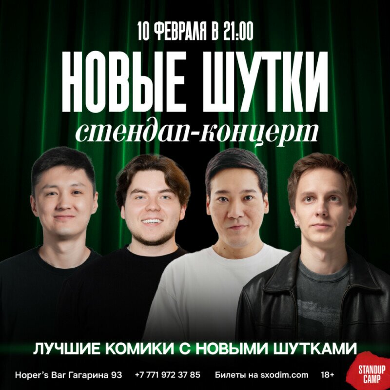 Этим вечером на сцене выступят 4 лучших комика — Тілеген Еркінбеков, Темирлан Жалдыбаев, Аманжан Махметов и Андрей Айрапетов!