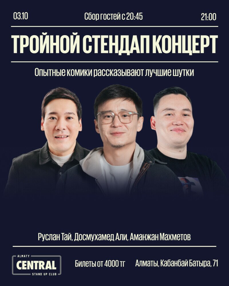 Руслан Тай, Аманжан Махметов и Досмухамед Али выходят на одну сцену, чтобы провести вечер с лучшими шутками из своего репертуара. Три опытных комика, три разных стиля и один концерт, наполненный юмором и живым взаимодействием с залом.