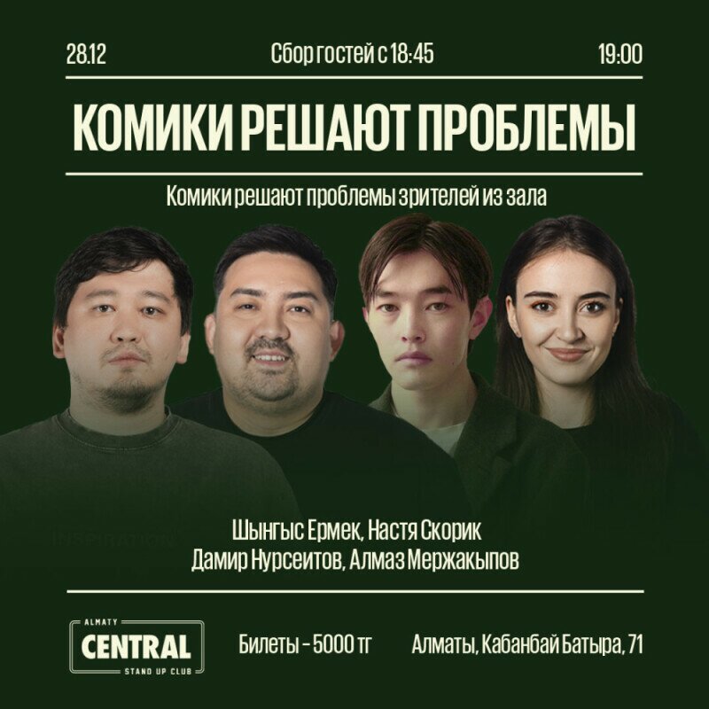 Комики: Шынгыс Ермек, Настя Скорик, Дамир Нурсеитов и Алмаз Мержакыпов.