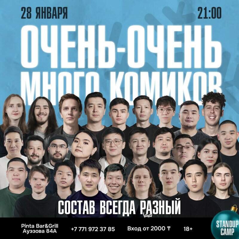 Среди выступающих можно будет встретить участников разных популярных шоу с YouTube, таких как “Almaty Central Stand-Up Club”, “Stand-Up Astana”, шоу “На слабо”, “Тюркский разговорник”, шоу “Setaptar”, открытый микрофон на ТНТ, и из других проектов.