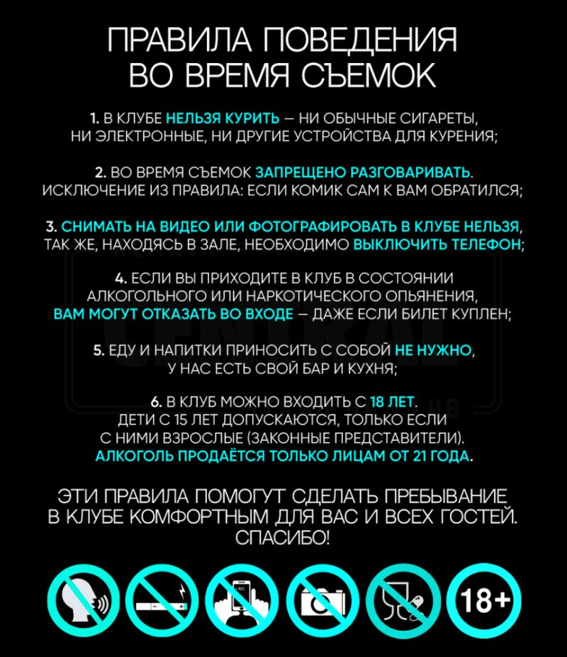Данное мероприятие носит исключительно развлекательный характер, не несет в себе цель задеть/ обидеть/ оскорбить чьи-либо чувства. Все, что сказано на сцене, представлено исключительно в образовательном и юмористическом ключе. Приобретая билеты, вы полностью принимаете данное предупреждение и нижеизложенные правила.