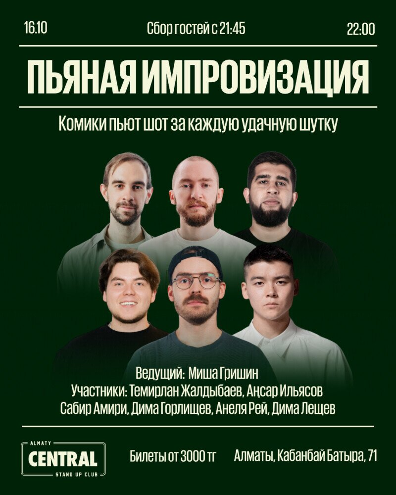 Комики пьют шот за каждую зашедшую шутку. Но прежде: лучшие импровизаторы города делятся на 2 команды, а победителя выбирают зрители. Будет интересно и несомненно смешно!