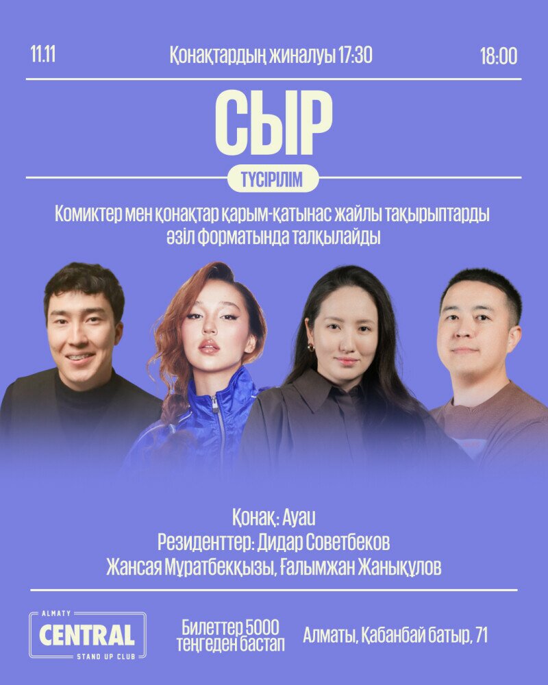 Бұл іс-шара тек көңіл көтеру мақсатында жасалып отыр. Ешкімді ренжіту, қорлау немесе жынына тию мақсатын алдына қойып отырған жоқ. Сахнадан айтылған сөздерді тек әзіл ретінде қабылдауларыңызды сұраймыз. Билет сатып ала отырып, төменде көрсетілген шарттармен толық келісетініңізді растайсыз.