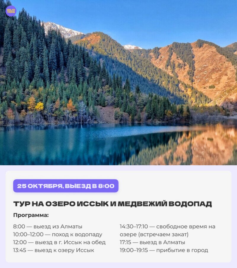 Вас приглашают поехать в тур к этому озеру, заодно прогуляться до Медвежьего водопада. Поход до водопада несложный — примерно 30 минут, есть подъемы, но не крутые.