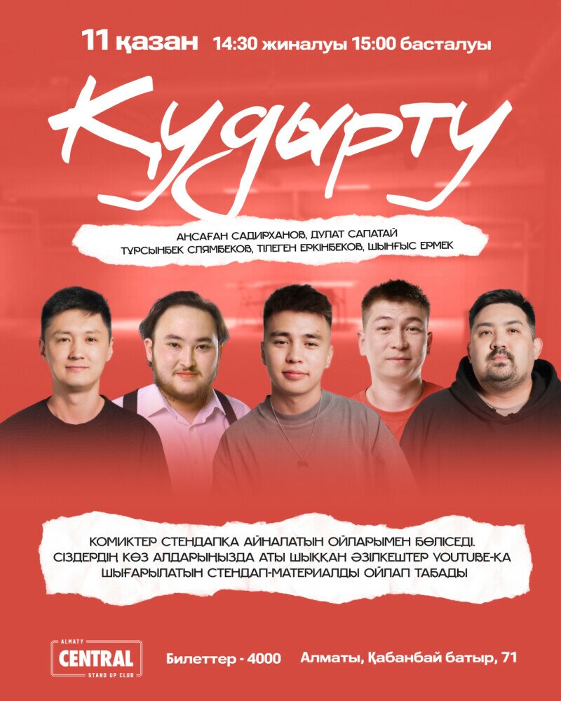 Бұл іс-шара тек көңіл көтеру мақсатында жасалып отыр. Ешкімді ренжіту, қорлау немесе жынына тию мақсатын алдына қойып отырған жоқ. Сахнадан айтылған сөздерді тек әзіл ретінде қабылдауларыңызды сұраймыз. Билет сатып ала отырып, төменде көрсетілген шарттармен толық келісетініңізді растайсыз.