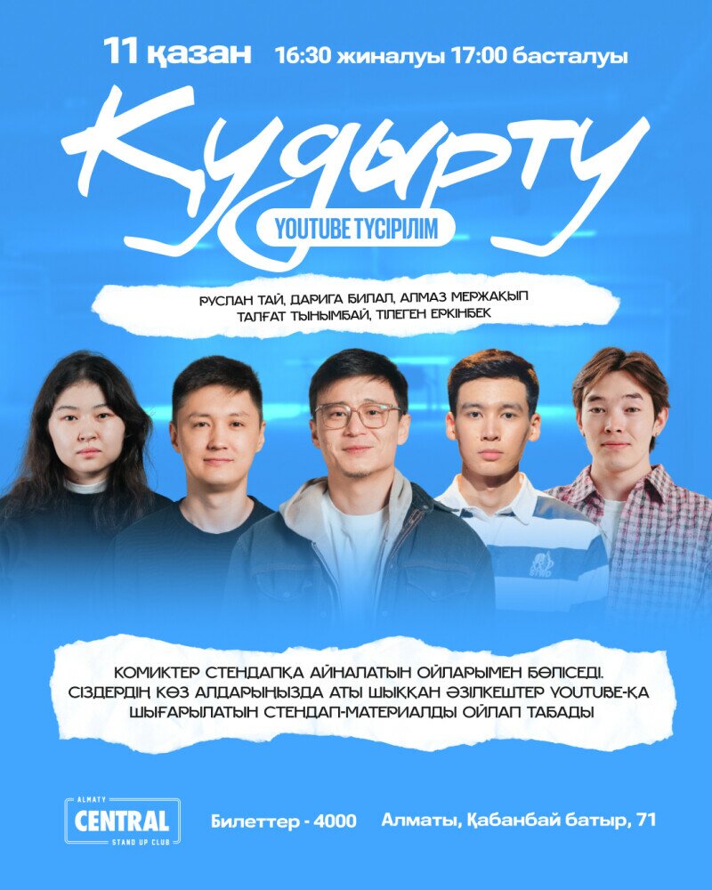 Бұл іс-шара тек көңіл көтеру мақсатында жасалып отыр. Ешкімді ренжіту, қорлау немесе жынына тию мақсатын алдына қойып отырған жоқ. Сахнадан айтылған сөздерді тек әзіл ретінде қабылдауларыңызды сұраймыз. Билет сатып ала отырып, төменде көрсетілген шарттармен толық келісетініңізді растайсыз.