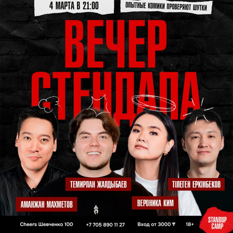 Этим вечером вы услышите новые шутки от опытных комиков Алматы! Проведите этот вечер в компании стендап комиков!