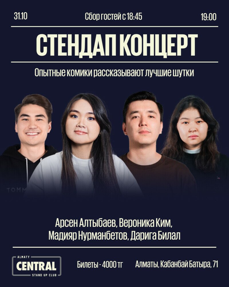 Мадияр Нурманбетов, Вероника Ким, Арсен Алтыбаев и Дарига Билал выходят на одну сцену, чтобы провести вечер с лучшими шутками из своего репертуара. Четыре опытных комика, Четыре разных стиля и один концерт, наполненный юмором и живым взаимодействием с залом.