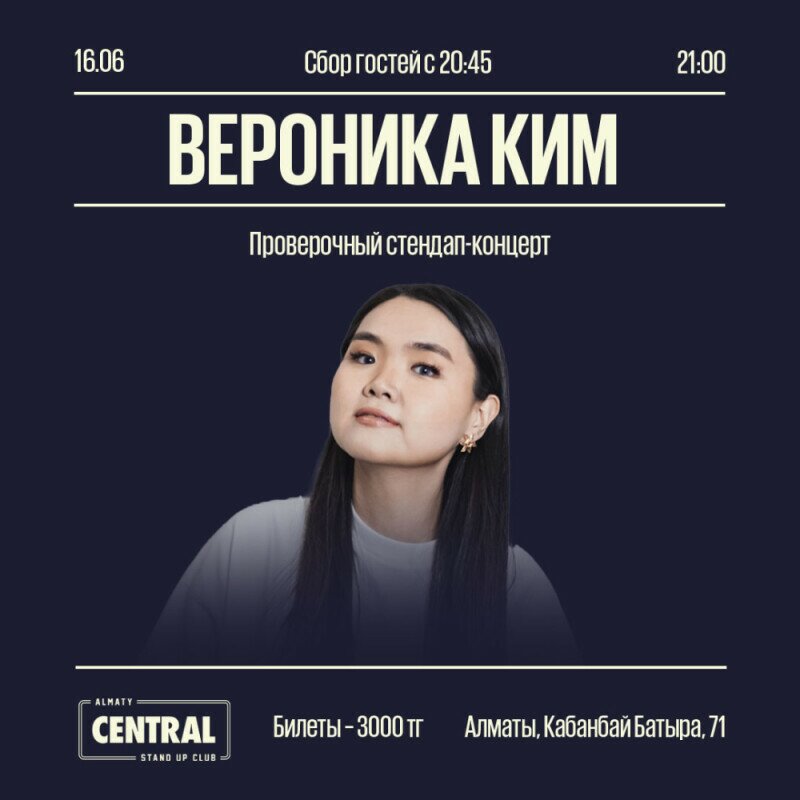 Вероника Ким — одна из первых женщин стендап-комиков в Казахстане. Она не разделяет комедию на гендер и делится историями из жизни. Участница шоу «Открытый микрофон», «Comedy Battle» на ТНТ и «Рассмеши комика» на телеканале «Интер». Первый комик Казахстана, который попал в список Forbes 30 under 30.