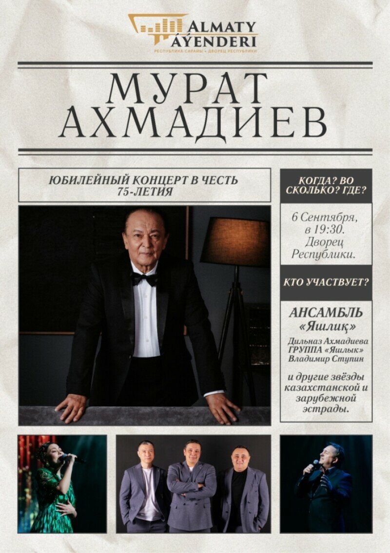 75-летний юбилей Народного артиста РК Мурата Ахмадиева – грандиозный концерт, посвящённый легенде казахстанской сцены. Вас ждёт незабываемое шоу с участием: