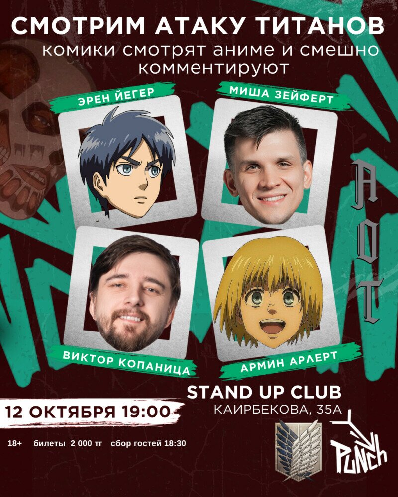 Смотрим Атаку Титанов - шоу, где комики смотрят Attack on Titan и шутят вслух. Эпичные сцены превращаются в абсурдные сравнения, драма — в стендап, а даже тем, кто не видел аниме, будет смешно и понятно. И всё это в уютном стендап клубе Punch кухней и баром, где готовят потрясные бургеры.