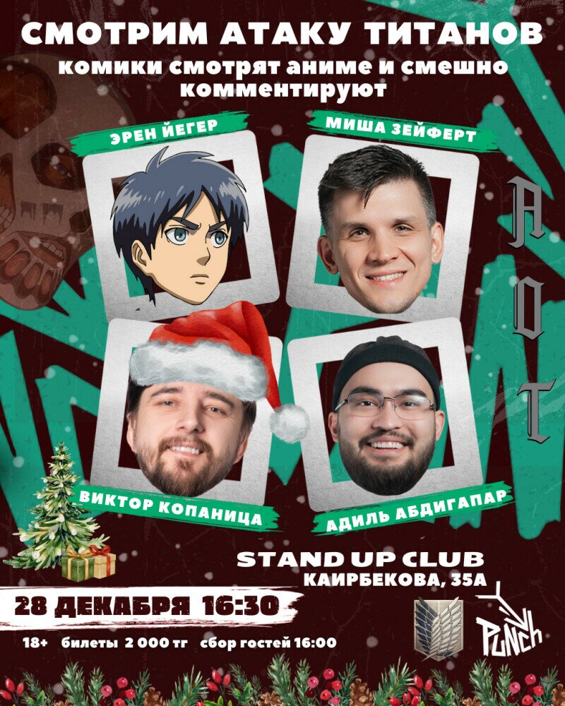 Смотрим Атаку Титанов - шоу, где комики смотрят Attack on Titan и шутят вслух. Эпичные сцены превращаются в абсурдные сравнения, драма — в стендап, а даже тем, кто не видел аниме, будет смешно и понятно. И всё это в уютном стендап клубе Punch кухней и баром, где готовят потрясные бургеры.