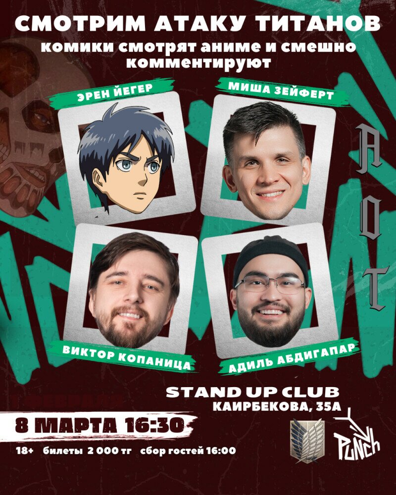 Смотрим Атаку Титанов – шоу, где комики смотрят Attack on Titan и шутят вслух. Эпичные сцены превращаются в абсурдные сравнения, драма — в стендап, а даже тем, кто не видел аниме, будет смешно и понятно. И всё это в уютном стендап клубе Punch кухней и баром, где готовят потрясные бургеры.