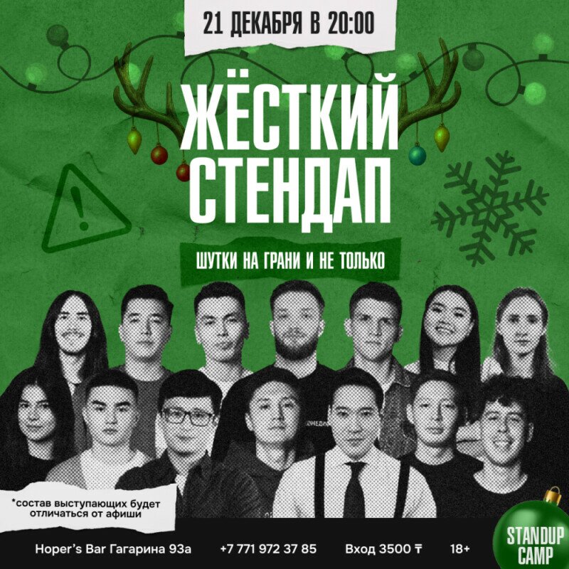 Выступят 6 опытных комиков с лучшим и свежим материалом. Кто именно - узнаете на самом мероприятии. Поверьте, им есть что обсудить и над чем посмеяться без стыда вместе со зрителями.
