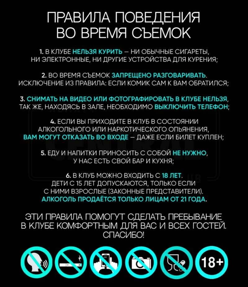 Данное мероприятие носит исключительно развлекательный характер, не несет в себе цель задеть/ обидеть/ оскорбить чьи-либо чувства. Все, что сказано на сцене, представлено исключительно в юмористическом ключе. Приобретая билеты, вы полностью принимаете данное предупреждение и нижеизложенные правила.