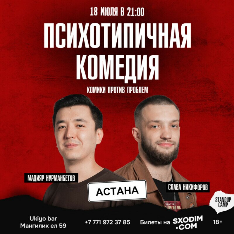 Психотипичная комедия — это интерактивное шоу Славы Никифорова и Мадияра Нурманбетова, где гости делятся своими ситуациями, а комики отвечают на них с юмором и дерзостью. Без гарантий решений, но со смехом, импровизацией и неожиданными советами — каждый уходит с улыбкой.