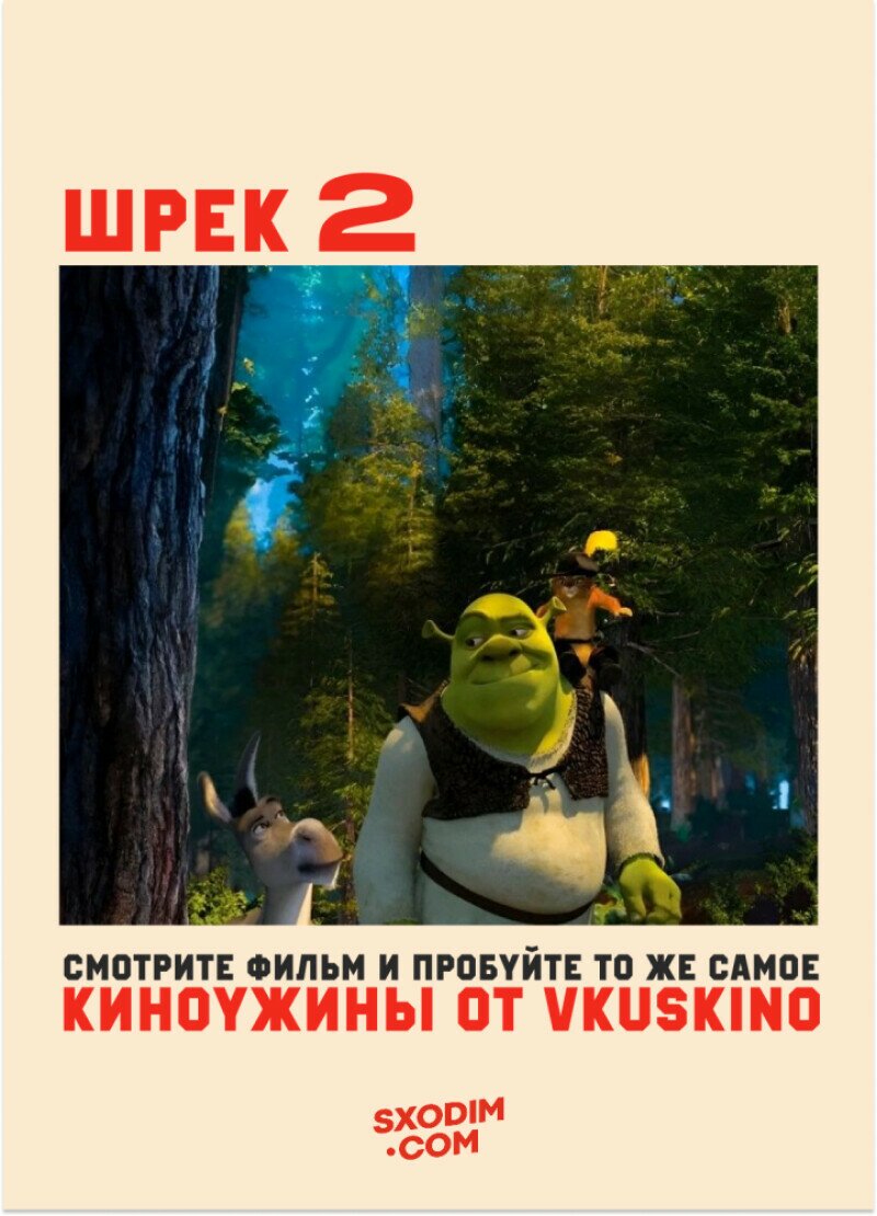 Со VkusKino Шрек 2 оживёт не только на экране, но и на ваших тарелках. Добро пожаловать в мир, где вместо вина — волшебные зелья, а в меню — гастрономическое путешествие по болотам, замкам и закулисью Тридевятого королевства.