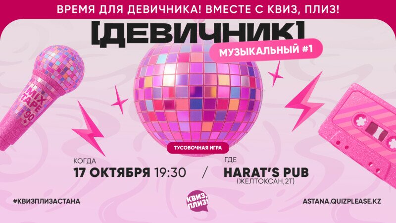 Главные правила музыкального девичника в Квиз, плиз! такие: веселиться, есть, пить, подпевать всему подряд и получать удовольствие от чилловой игры. Не беспокойтесь о сложности песен — вы все их знаете! Давайте покажем, как кайфово поют, танцуют и отдыхают девушки!