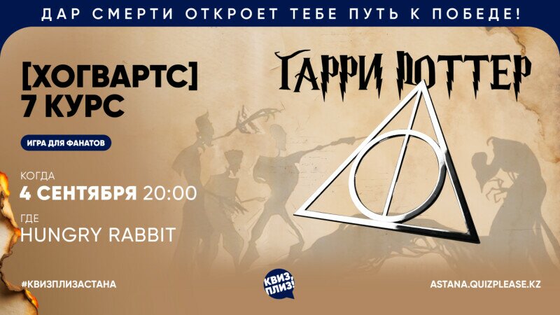 Добро пожаловать в школу чародейства и волшебства Хогвартс! В версии Квиз, плиз!, конечно же. Да начнётся обучение интеллектуально-развлекательной магии. В программе седьмого курса вас ждут вопросы, связанные с седьмой частью вселенной мальчика, который выжил — спросим вас всё про «Дары смерти». Да-да, как про две части киносаги, так и про книгу.