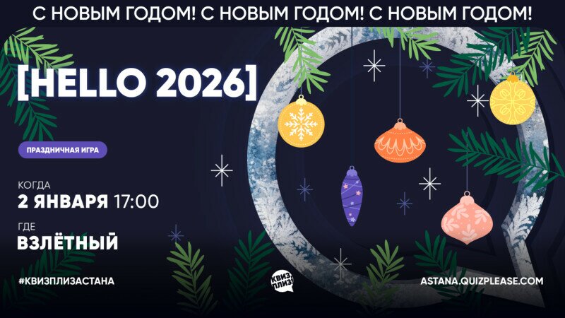 Есть у нас такая традиция: каждый год, как только наступают первые морозы, а магазины украшают витрины по-новогоднему, Квиз, плиз! готовит игры с новогодним вайбом. Одна из таких игр — [HELLO 2026]. Вас ждёт 7 раундов с интересными вопросами про 2025 или про Новый Год. После этой игры вы сможете сформулировать идеальный тост, которым можно будет проводить 2025 и встретить 2026!