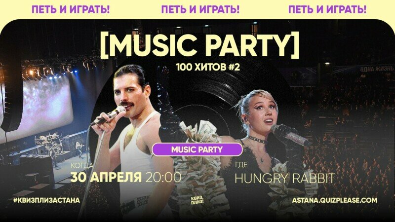 [music party] – любимый формат настоящих тусовщиков. А с музыкой веселья становится даже больше. Особенно, когда музыка легендарная. Здесь собрали для вас ровно 100 самых разных песен за всю историю музыки. Будут даже самые современные треки! Чтобы прослушать такой плейлист, нужно где-то 5 часов. Но в версии Квиз, плиз! вы насыщаетесь энергией лучших хитов всего за 2 часа! Можно молчать, можно петь, угадывать мелодии или пить пенное, но всё равно кайфовать