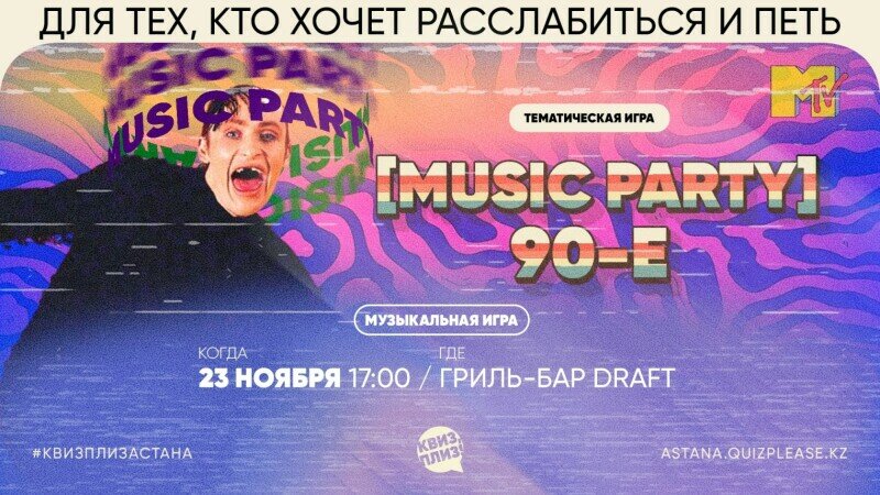 [music party] – это формат музыкальных игр Квиз, плиз!, в которых музыка и хорошее настроение превыше всего. В этой игре сосредоточимся на культовой музыке 90-х и проверим свою наслушанность.