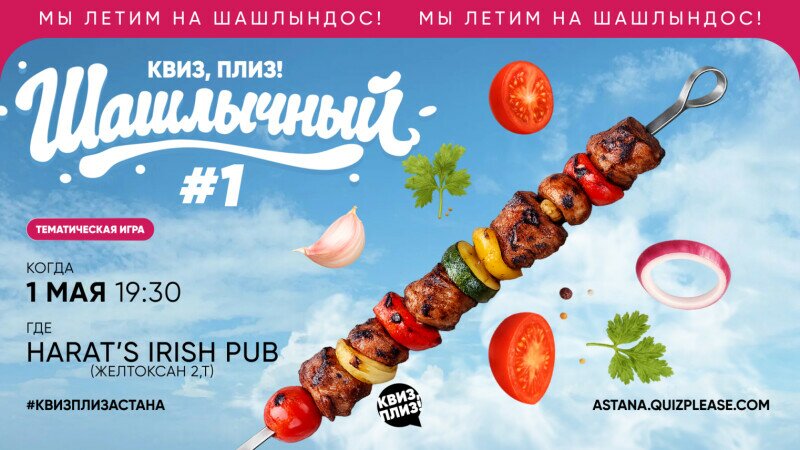 Какая вкусная получилась игра: не пересушили, не пережарили и сырой не оставили. Спросим вас про всё, что связано с выездом на шашлыки: что взять в дорогу, что добавить в маринад и о чём говорить около мангала. Это даже лучше отдыха на свежем воздухе, ведь на этой игре вы почувствуете запах шашлыка и костра, но дым наконец-то не будет попадать в глаза. Захотелось? Тогда собирайте команду «шампура и углей» и приходите на наш интеллектуальный пикничок.