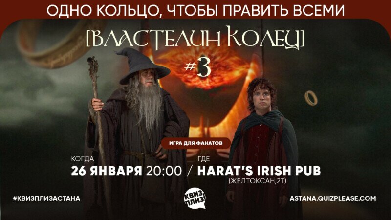 Если вы еженедельно устраиваете 20-часовой марафон киновселенной Властелина колец. Если вы тайно учите чёрное наречие и обзываете на нём нелюбимого босса — ваш путь лежит на Квиз, плиз! [Властелин колец]. Вас ждет 7 раундов, 51 вопрос по Властелину колец и 2,5 часа отличной интеллектуальной разминки.