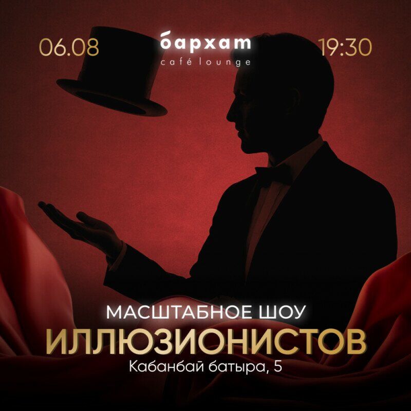 Бархат cafe&lounge» пройдёт масштабное шоу иллюзионистов от лучших в Казахстане. Вечер, который подарит магию и эмоции детям и взрослым.