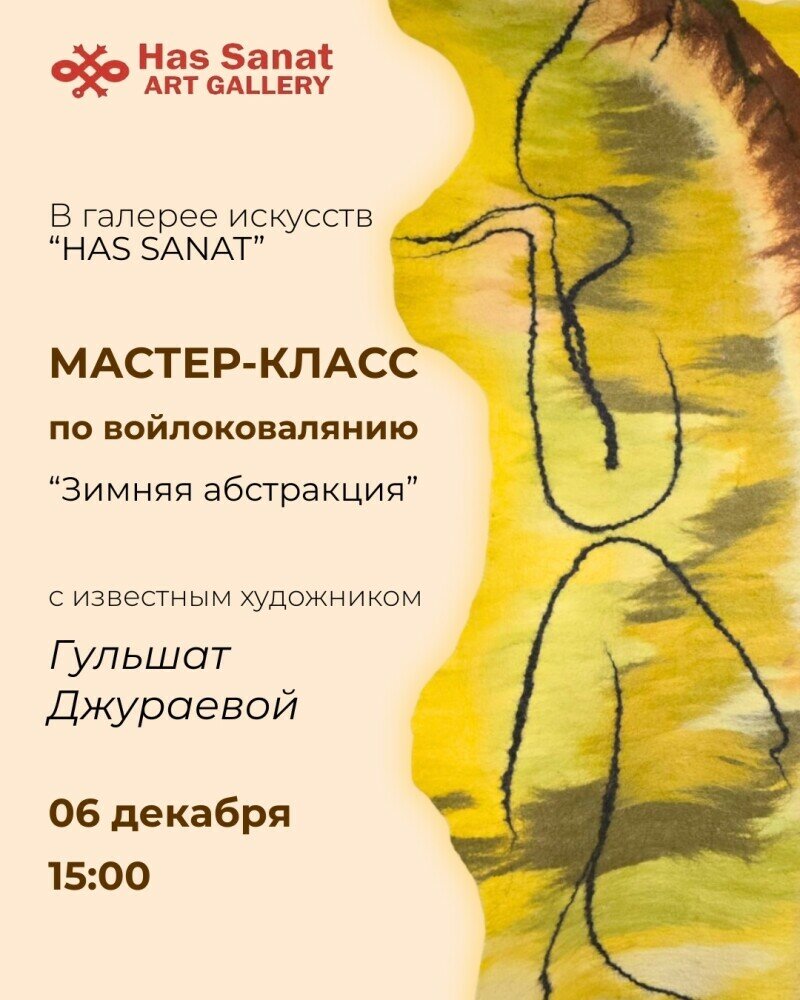 В галерее искусств «HAS SANAT» Мастер-класс вместе с известным художником Гульшат Джураевой «Зимняя абстракция» в технике войлоковаляние по мокрому. Живописное войлочное панно — это картина из шерсти, созданная без красок и кистей. Образ рождается за счёт сочетания цветов, фактур и тонких слоёв волокон. Такое панно выглядит как картина, но обладает мягкостью, глубиной и уникальной фактурой.
