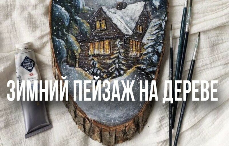 Создайте зимний пейзаж на настоящем спиле дерева! Это то, что вы действительно никогда не делали: необычный круглый формат и использование сруба дерева в качестве основы.