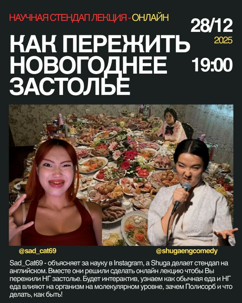 @sad_cat69 – популярная науч-поп инфлюенсер совместно со стендап-комикессой Шұғылой Сағынбековой проведет онлайн научную стендап-лекцию, на которой можно будет разобраться – как пережить Новогоднее застолье?