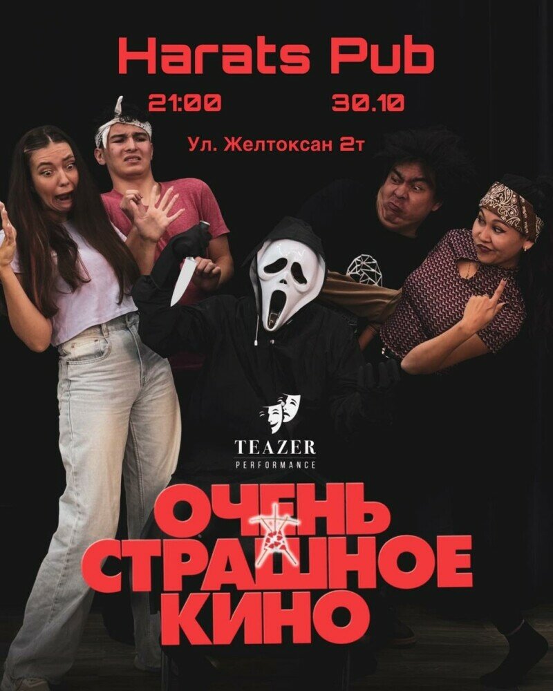 Перформанс-группа Teazer приглашает вас на незабываемый Хэллоуинский перфоманс по мотивам фильма «Очень страшное кино» в Harat’s Pub Гранд Алатау