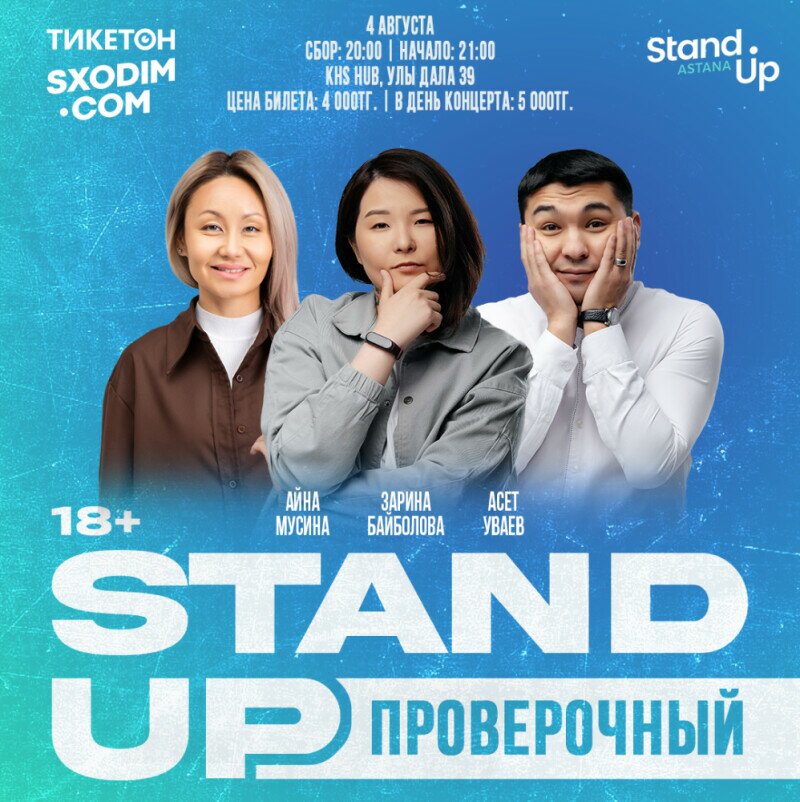 Гарантируем, что вы сможете от души посмеяться и наполнить этот вечер лишь положительными эмоциями, ведь на сцене выступят зарекомендовавшие себя комики: Зарина Байболова, Асет Уваев и Айна Мусина!