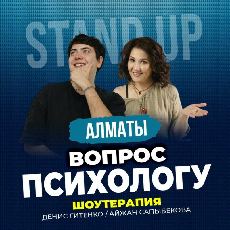 На сцене – Айжан Сапыбекова (Позитивная Айжан), она же психолог, и смешной Денис Гитенко – искрометный комик!