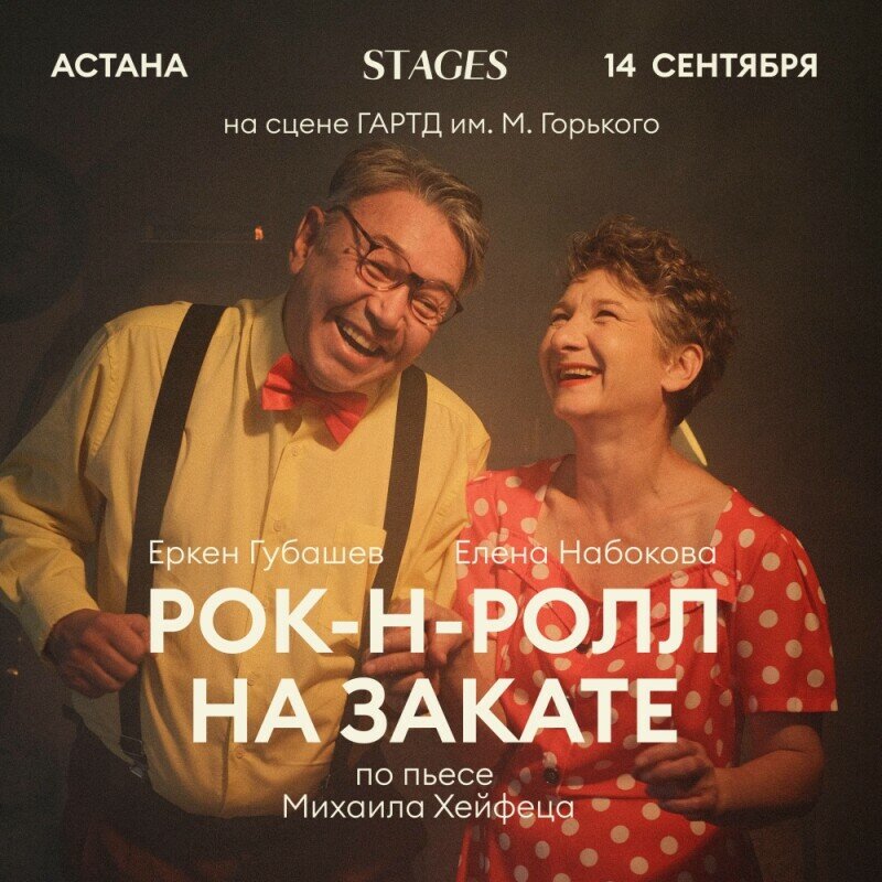 Stages — успешный независимый музыкальный театр из Алматы, соединяющий театр, музыкальное искусство и хореографию. Известен зрителю спектаклями для большой сцены «Счастливые поют», «Состояние танго», «Золотой квадрат», «Дирижёр любви» и другие. «Рок-н-ролл на закате» — первая постановка театра для камерного пространства.