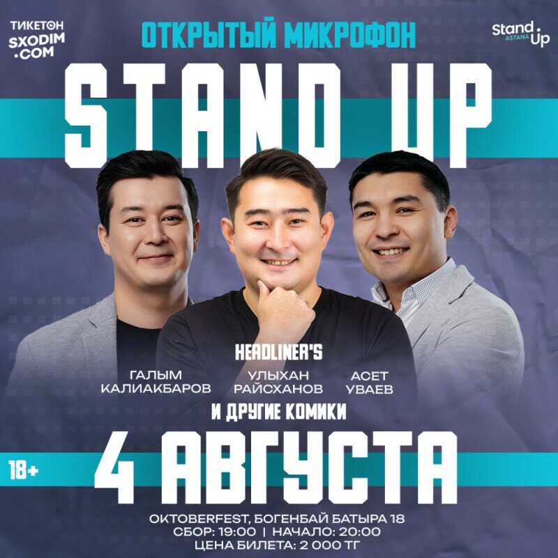 Гарантируем, что вы сможете от души посмеяться и наполнить этот вечер лишь положительными эмоциями, ведь на сцене выступят зарекомендовавшие себя комики, среди которых: Галым Калиакбаров, Асет Уваев и другие!