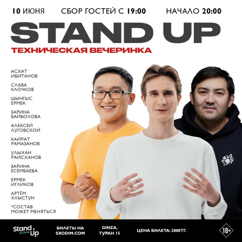 Гарантируем, что вы сможете от души посмеяться и наполнить этот вечер лишь положительными эмоциями, ведь на сцене выступят зарекомендовавшие себя комики: Асхат Ибитанов, Слава Клочков, Шынгыс Ермек, Зарина Байболова, Алексей Луговской, Кайрат Рамазанов, Улыхан Райсханов, Зарина Есембаева, Ермек Игликов и Артём Хлыстун.