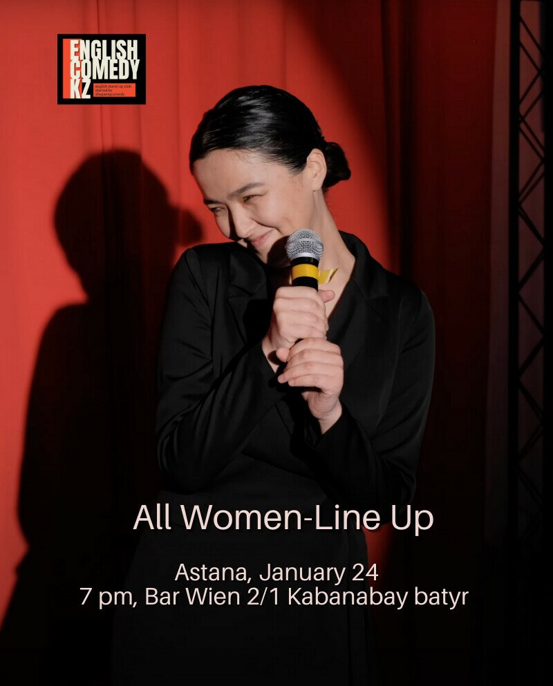 Join us for a night of bold, witty and honest comedy performed by women who do stand-up in English. This is the 17th English-language open mic organised by English Comedy Kz, started by Shugyla Sagynbekova. She has been developing English stand-up comedy since 2023, and after a trip to Chicago in 2024, she held her first solo show - among the audience was the US Ambassador.