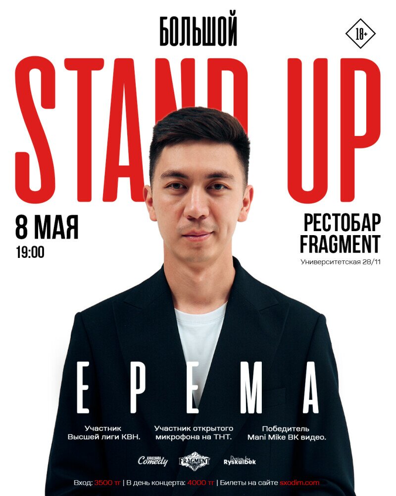 Ерема – стендап-комик из Москвы, но родом из Талдыкоргана. Юморист с невероятной харизмой. Участник Высшей лиги КВН, участник открытого микрофона на ТНТ, победитель Money Mic ВК видео.